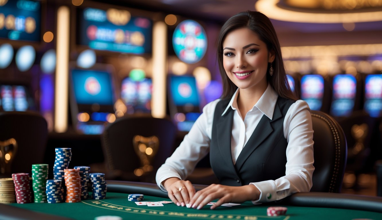 Seorang dealer wanita tersenyum duduk di meja permainan kasino dengan kartu dan chip, di lingkungan kasino yang elegan.